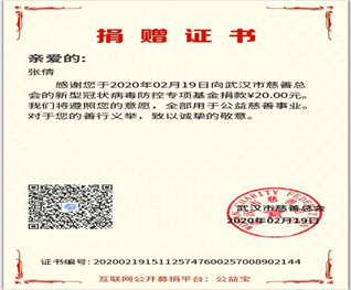 会计学院统计与会计核算专业,18统会4班张倩同学,成为传递爱与快乐的使者,向武汉市慈善总会的新型冠状病毒防控专项基金捐款。