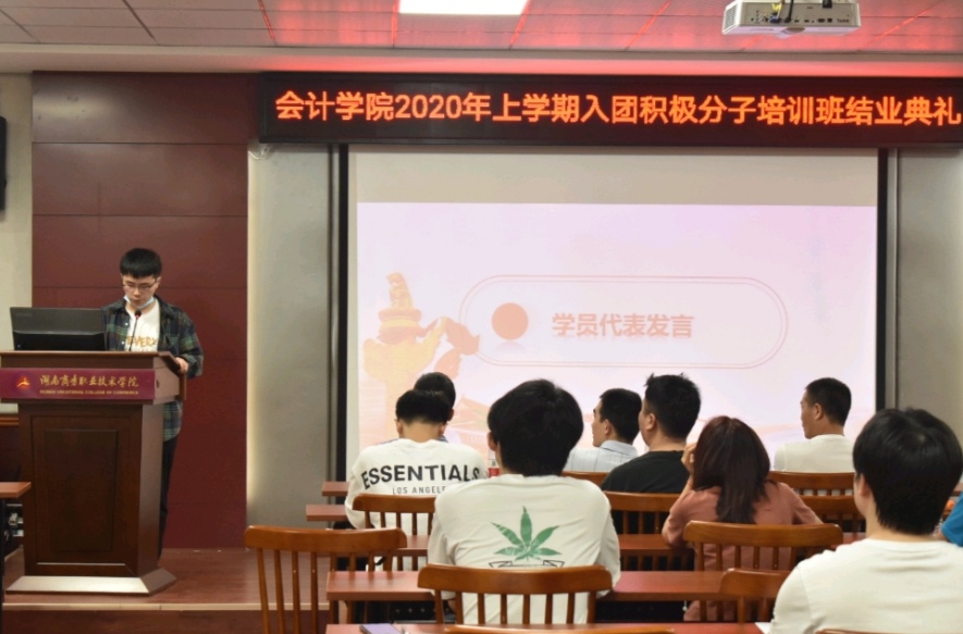 在一番筹备后,6月5日12:30湖南商务职业技术学院会计学院入团积极分子结业典礼在2教201举行,此次会议由会计学院团总支副书记也是此次入团积极分子培训班班主任陈炼主持,参加会议的有会计学院党总支书记石辉金,团总支书记朱泳霖,校团委书记杨明,会计学院团总支第一副书记,第二副书记,组织委员以及33名入团积极分子。