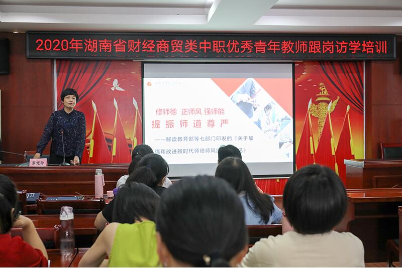 随后易兰华向参训学员介绍了我院70年来一直秉承的办学理念、坚持的办学定位,以及在财经贸易类人才培养及专业建设取得的成果。他表示,学院及相关部门都非常重视此次培训,为此制定了科学严谨的培训方案,组建了实力雄厚、经验丰富的教学与指导团队,他期待老师们通过此次培训能进一步拓宽教育理论视野,强化实践运用能力,提升作为优秀青年骨干教师的专业素养和教学能力。同时,他提出了三点要求,转变角色,明确培训目的;调整心态,提高培训的主动性和自觉性;遵章守纪,增强培训的严肃性。开班仪式结束后,李定珍校长给青年教师们讲授了一堂《修师德、正师风、强师能》的主题讲座。