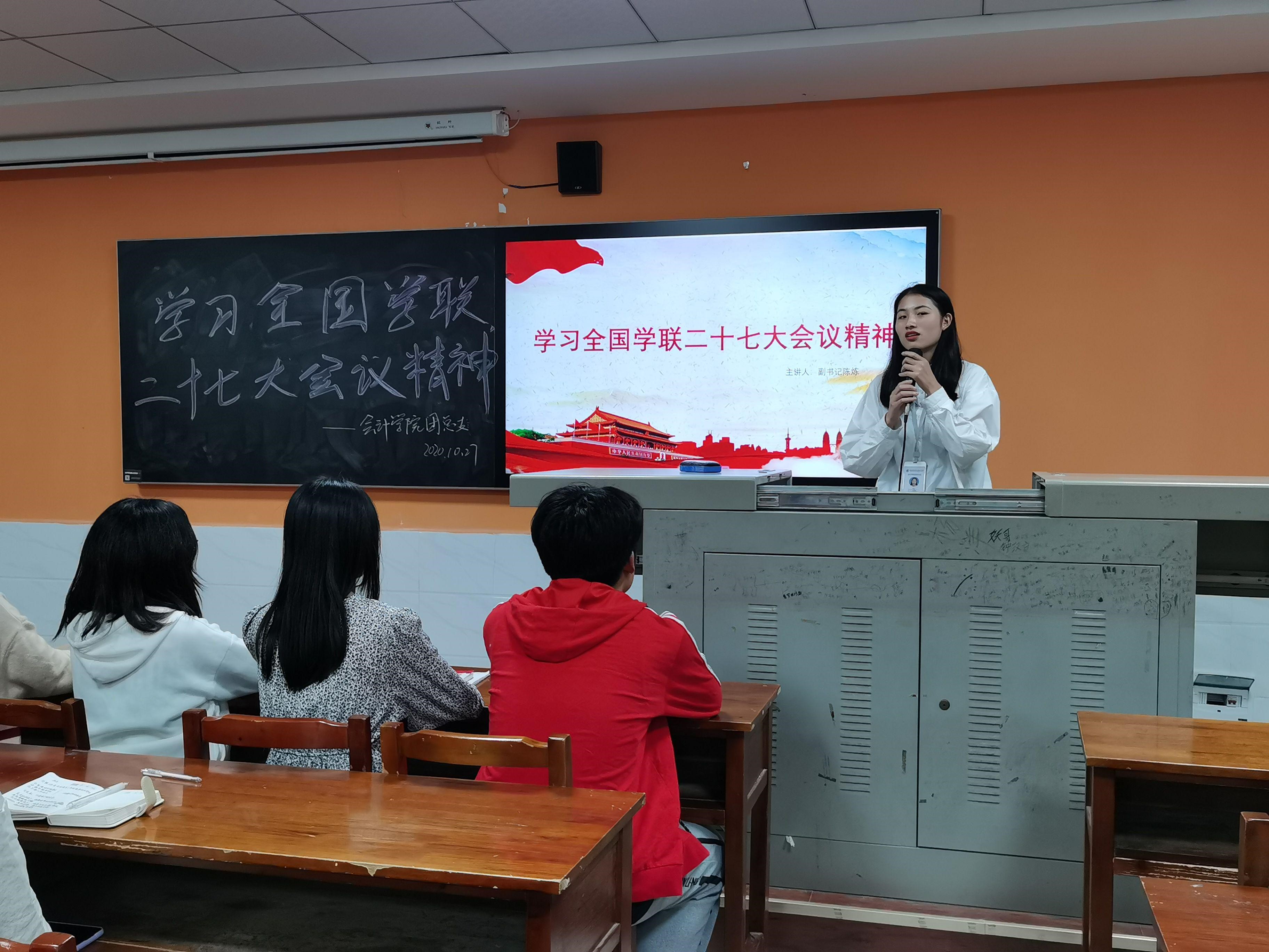 2020年10月27日晚上18:00,湖南商务职业技术学院会计学院宣传部和各级各班宣传委员于2教210室召开《学习全国学联二十七大会议精神》会议,本次会议由团总支副书记陈炼主讲。会议目的是为了更好地落实全国学联二十七大会议精神、为了认真学习宣传贯穿全国学联二十七大习近平同志贺信和党中央致词精神、为了提高我院学生干部综合素养,培育胸怀理想、心系同学、作风扎实的学生干部。