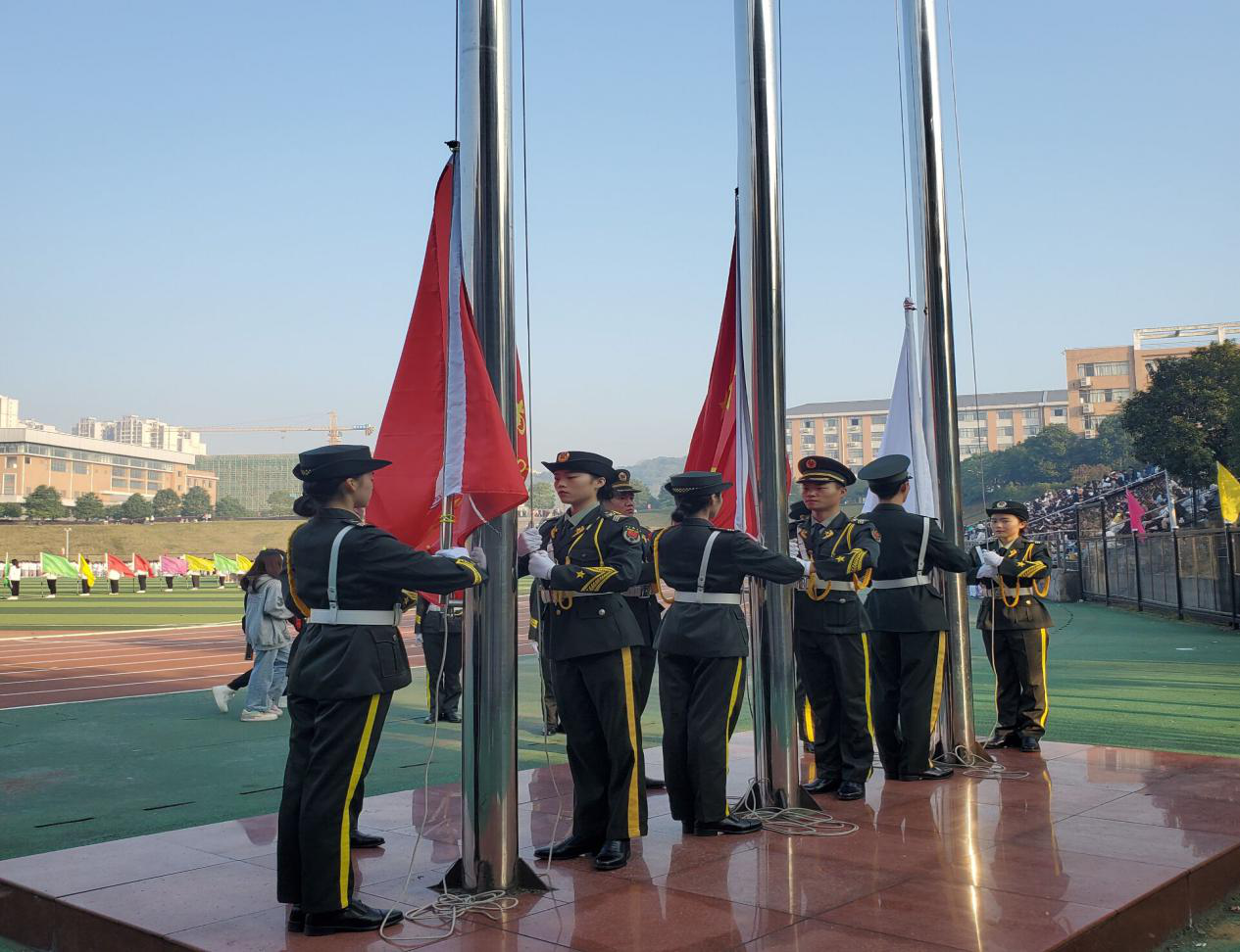 各队方阵井然有序的走到操场中央,操场上奏响了国歌,全场肃静,全体起立,护旗手们神色庄重,紧攥着国旗的四角,身姿挺拔,踏着铿锵有力的步伐,将国旗护送至旗杆下,在万众瞩目下,五星红旗缓缓升起,随风飘扬;湖南商务职业技术学院校旗也伴随着校歌《流金岁月》缓缓升起,在场的所有同学都激动不已。