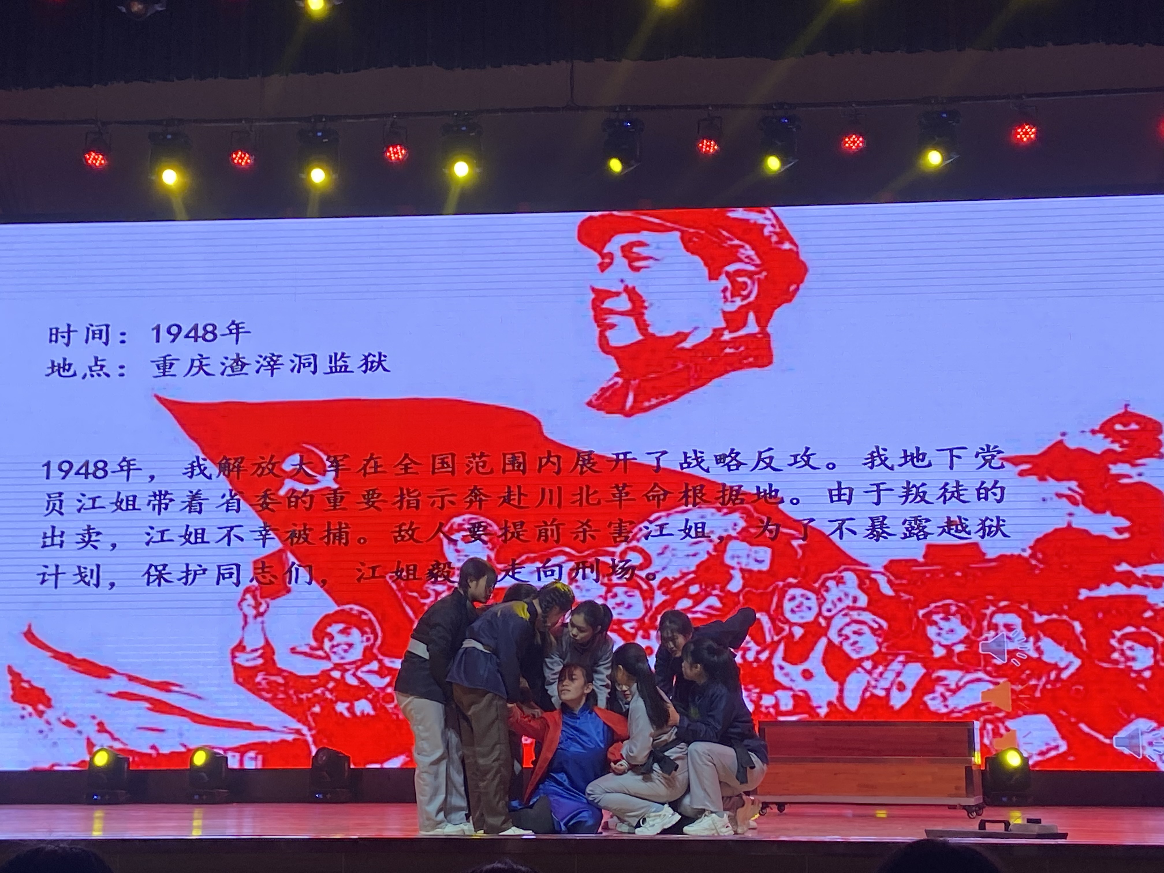 在这阵阵掌声中,20财管4班的选手们身着军装,手握五星红旗,给我们带来了第一个节目《打靶归来》他们慷慨激昂的声音充分展示出了他们的无数革命先辈的敬意。接着每个参赛班级都用他们的表演向我们传递着红色基因、红色文化。有博爱无私的聂荣臻将军,有睿智勇敢的英雄王二小,还有坚贞不屈的江姐……
