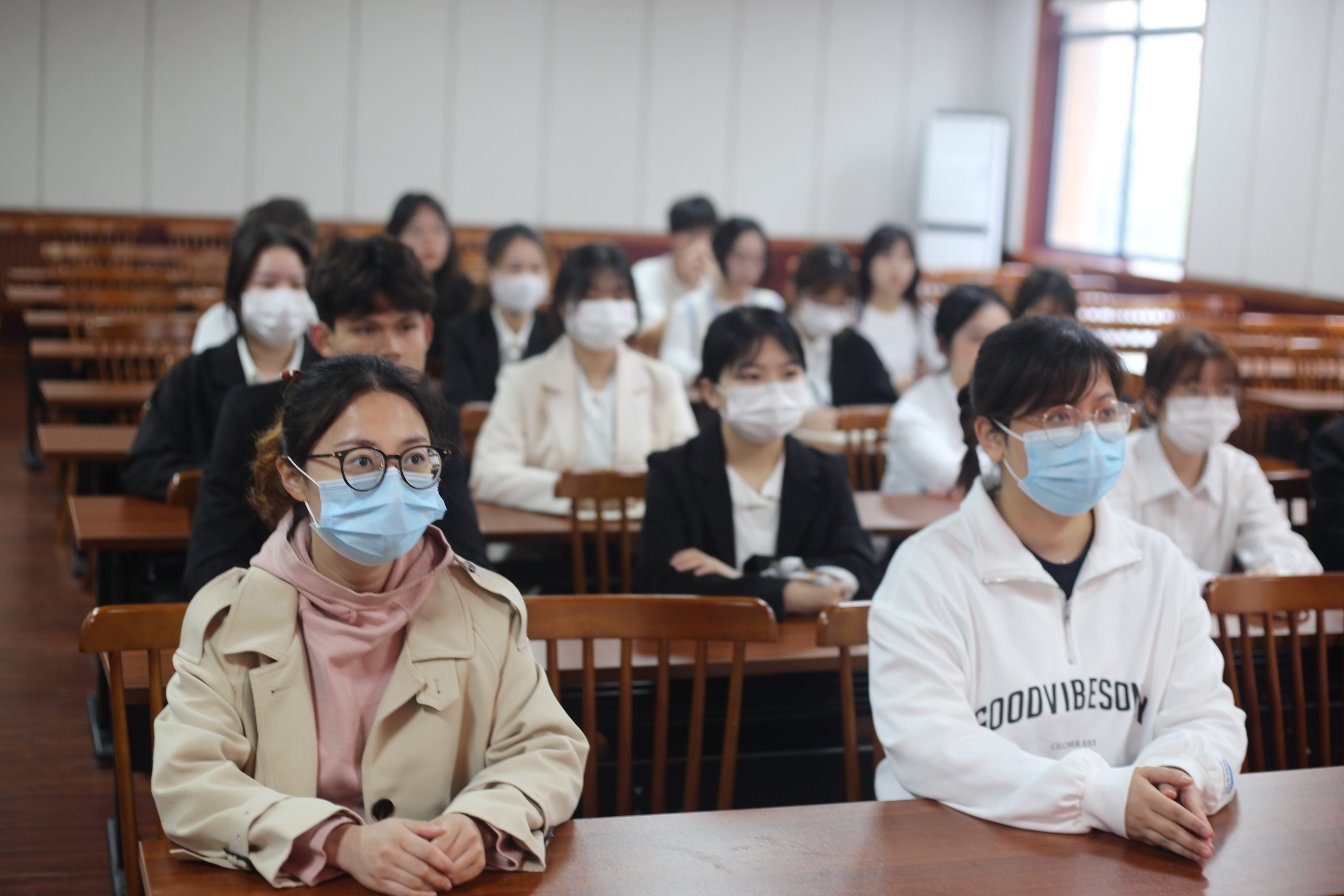 10:00,观看的学生干部们准时到达二教201,等待直播的开始。同学们都身着正装,到场后井然有序入座,自觉保持现场安静,彰显了会计学院学生干部的精神风貌和学习态度。