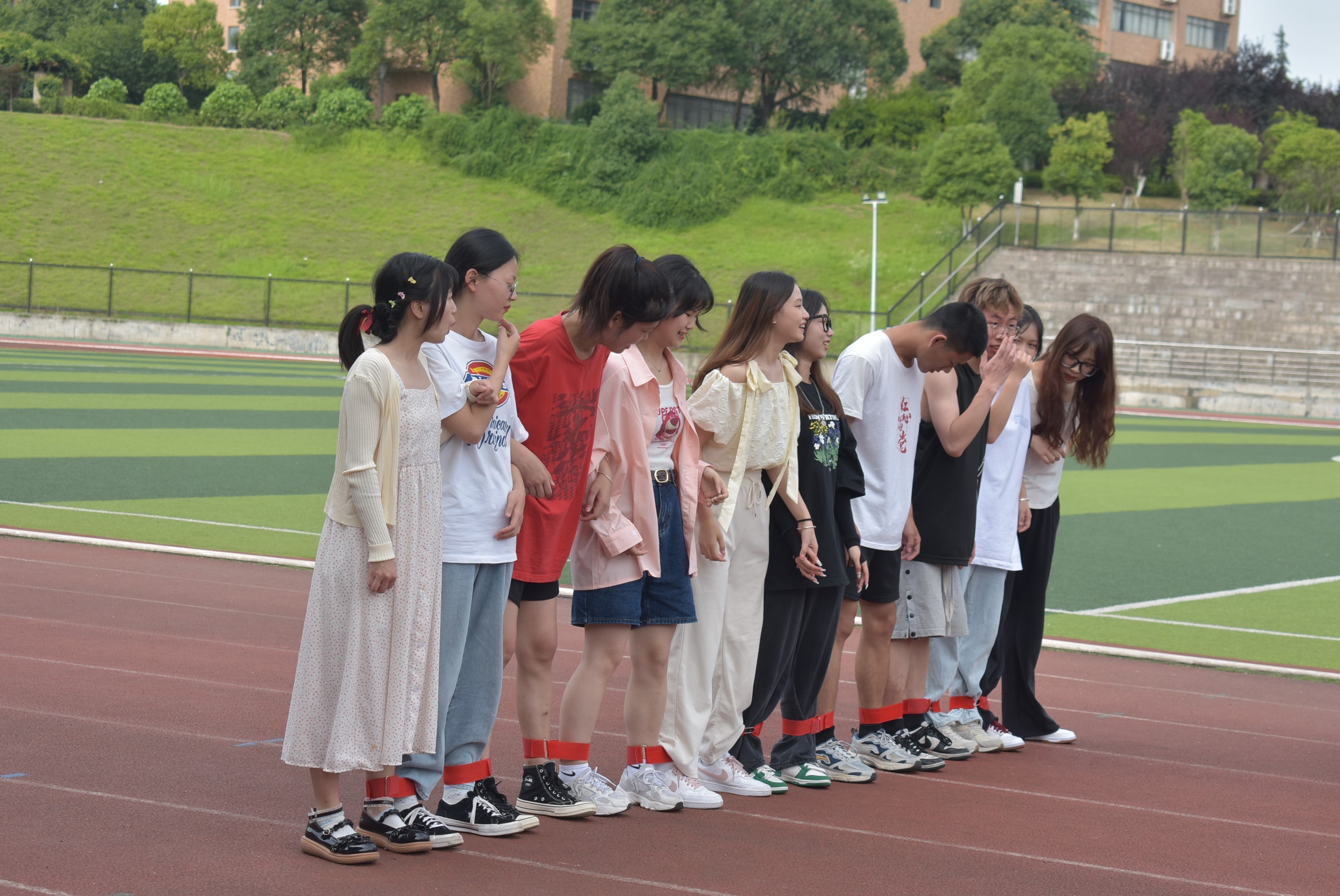 每支队伍成员排成一横排,相邻的人把腿系在一起,一起跑向终点,用时最短的胜出。一次分成两组进行比赛,四组为计时赛,按照用时排名次。
