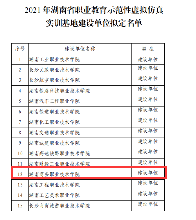 2021年3月29日,根据湖南省教育厅《2021 年湖南省职业教育示范性虚拟仿真实训基地建设(培育)单位拟定名单的通知》,我校会计学院主持的虚拟仿真实训基地成功入选2021 年湖南省职业教育示范性虚拟仿真实训基地建设项目。