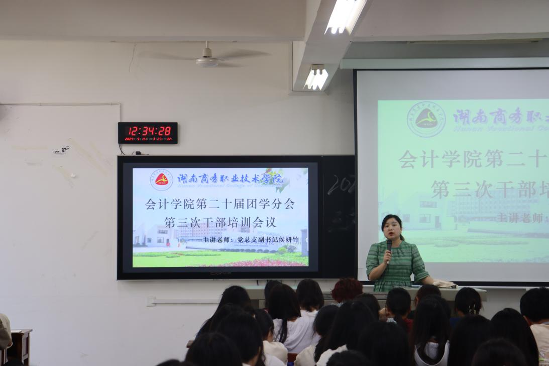 (通讯员:李欣馨)为落实做好学生干部工作能力培训工作,让团学分会干部了解新时代学生干部的担当作为。5月15日12:30,会计学院在博思楼301举行了第二十届团学分会第三次干部培训。本次培训由会计学院党总支书副书记侯妍竹主讲,会计学院团学分会全体干部参与培训。