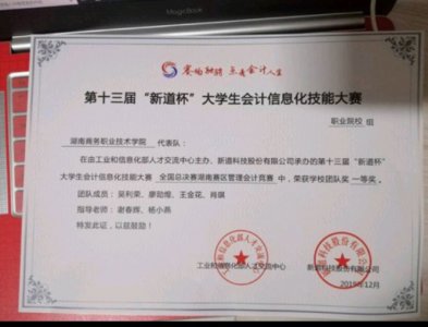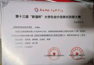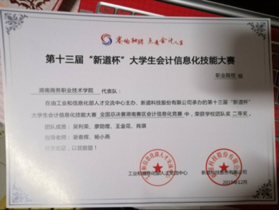2019年12月,在第十三届新道杯大学生会计信息化技能大赛全国总决赛湖南赛区会计信息化竞赛中,谢春辉、杨小燕老师指导的两支参赛队伍分别荣获了二…【查看全文】