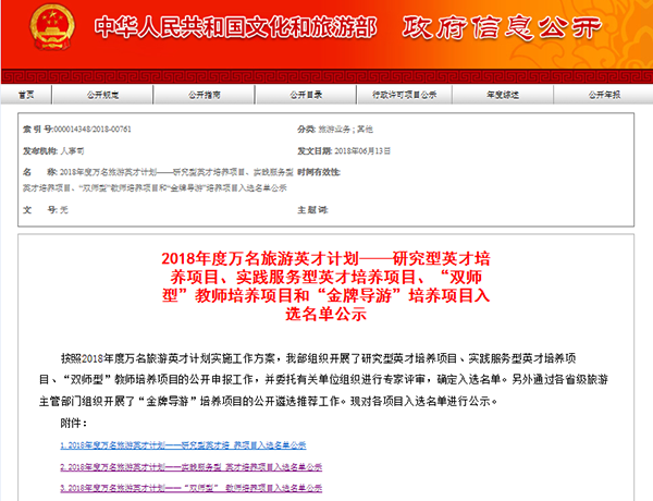 据悉,原国家旅游局2015年启动“万名旅游英才培养计划”,以项目资助为主要手段,分批遴选、培训万余名旅游相关专业的教师和学生,以吸引、激励更多优秀人才立志旅游工作、扎根旅游行业,进而增强中国旅游业人才核心竞争力。2018年度“万名旅游英才计划”由国家文化和旅游部实施,包括研究型英才培养项目、实践服务型英才培养项目、“双师型”教师培养项目和“金牌导游”培养项目四个类别。