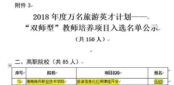 2018年6月13日,从国家文化和旅游部传来喜讯,经由文化和旅游部组织专家评审,旅游管理学院伍欣老师主持的《旅游信息化应用课程开发》入选“双师型”教师培养项目;由16旅管1班学生黄巧灵领衔的《长沙市望城区乡村旅游重点村协同发展调研及培训》入选实践服务型英才培养项目,两个项目均是湖南省高职层次上唯一入选项目。