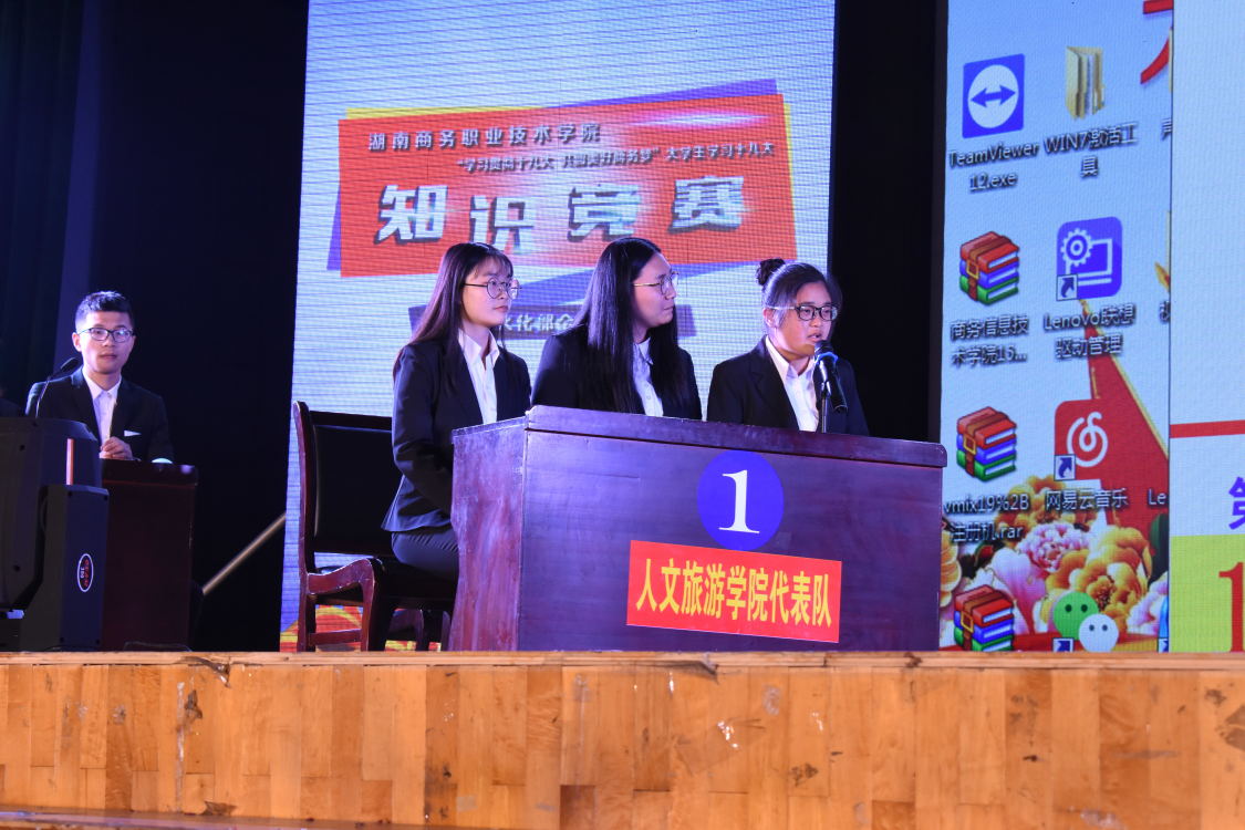 2017年12月26日晚7:00,人文旅游学院第一代表队于体育馆参加了湖南商务职业技术学院举行的十九大知识竞赛决赛。这次竞赛旨在增加大学生对十九大相关知识的了解,培养大学生的哲学社会科学基础知识。
