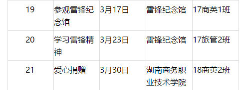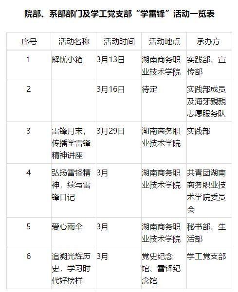 院部、系部部门、旅管学院各班级及学工党支部‘学雷锋’活动览表