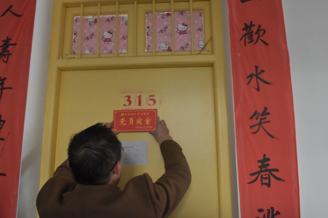 欧阳老师首先依次查看了学生党员宿舍的卫生情况,并针对存在的卫生问题提出了一些有效的建议,随后欧阳老师询问了学生党员在寝室的日常生活作风,并要求学生党员以身作则时刻保持着自身良好的作风状态,最后欧阳老师将代表着学生党员新身份“党员宿舍”门牌挂在各位学生党员的舍门上,并告知各位学生党员这个牌子不仅仅是一个牌子,它更是一种新的身份,新的责任。