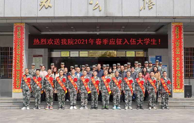 3月14日上午,我校2021年大学生参军入伍欢送会在办公楼前举行,校党委书记周忠新、副院长禹明华到场送别14名忠心献祖国、光荣入伍的学子。