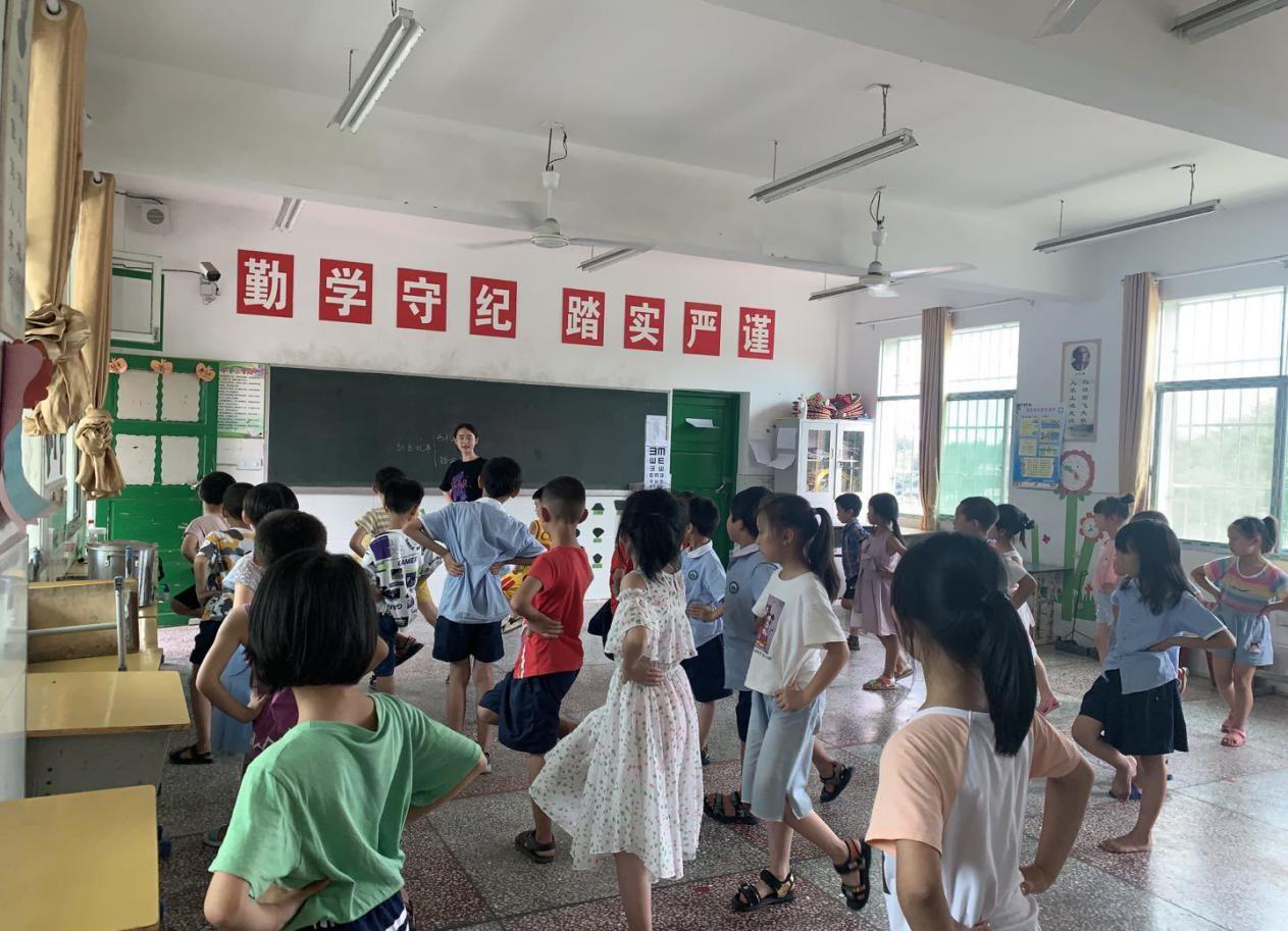 7月9日下午14时,“启明星计划”团队舞蹈老师19旅管2班邹桐怡与19酒管3班刘时珍首先走进了中年级的课堂,为岩坡小学学生开启了舞蹈第一课。与此同时,低年级和高年级的同学们也上起了绘画和体育课。