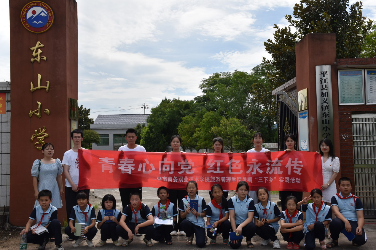 7月12日上午,湖南商务职业技术学院旅游管理学院“青春心向党,红色永流传”三下乡社会实践服务团队带着满腔的服务热情来到了岳阳市平江县加义镇东山村小学开展实践活动。