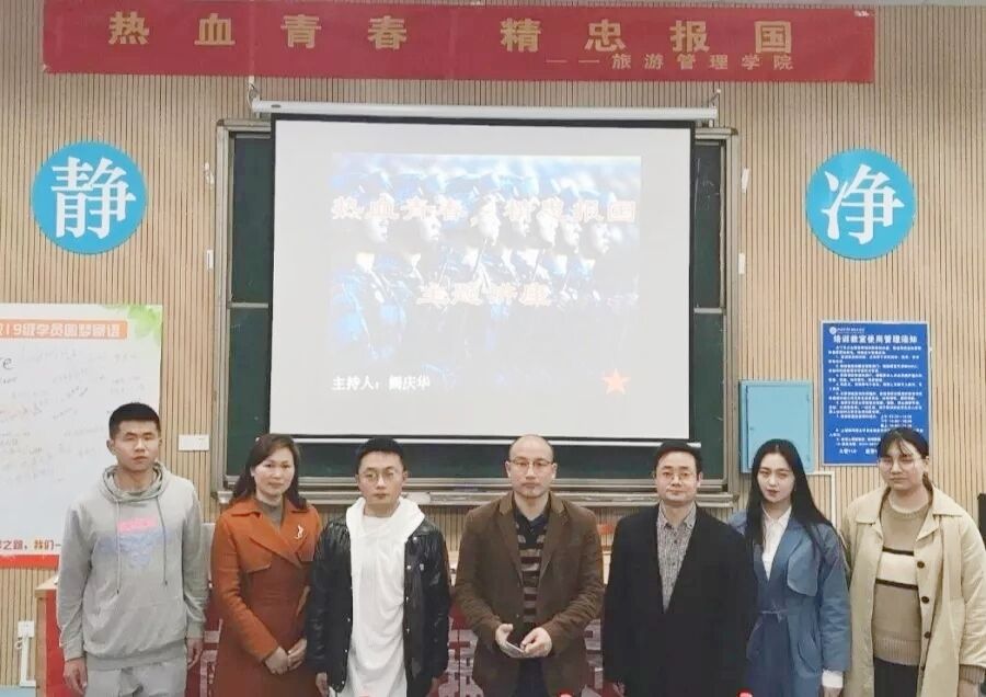 为了激励同学们勤奋学习,勇于实践,发奋成才,我旅管学院于2019年3月19日14:00,于一教101开展“中国梦,青春梦——热血青春,精忠报国”主题讲座。本次讲座辅导员名师主持人阙庆华老师作为主讲人,旅游管理学院党总支黄铖书记、团总支书记欧阳序华、13届学生彭瑞中学长应邀出席讲座。