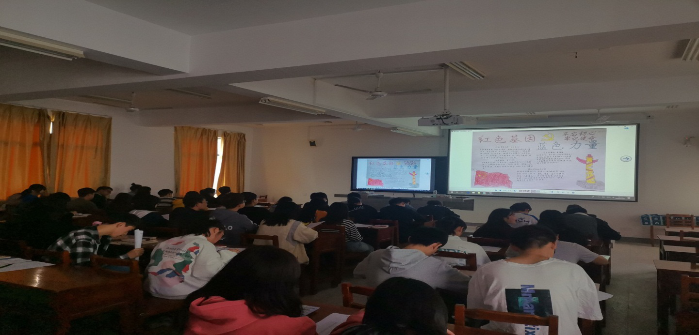 (本网讯 侯嘉鹏)2020年10月27日下午,商务信息技术学院入党积极分子培训班的同学们开展“红色基因,蓝色力量”主题手抄报比赛。同学们带上自己的作品来到2J-401,怀着学习的心态,参加比赛。