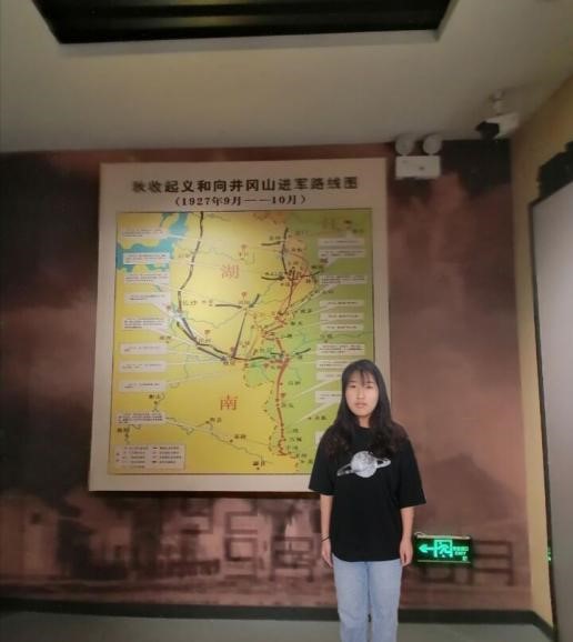 贺琼同志在参观秋收起义广场陈列馆时通过文字和图片的介绍,了解到了一些革命老党员的生平事迹,也看到了一些革命战争时期,红军用的大刀、煤油灯、蓑衣、长矛、土枪等工具。这让她体会到了革命红军的英勇无畏和勤俭节约的精神,参观后她感叹到,星星之火,开始在广阔的农村大地上,渐起燎原之势,作为一名学生党员,敢于改变,敢为天下先的精神,奋发学习、积极向上,为未来之中国做出贡献!
