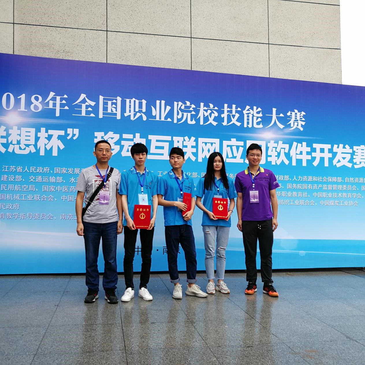 2018年全国职业技能大赛“移动互联网应用软件开发”赛项于5月21日在南京工业职院拉开帷幕。由我院软件专业廖清远、李庆两位指导教师,15软件4班曹星,16软件4班陈玮、胡祎三位学生组成的代表队在来自全国95所高职院校285名参赛选手的激烈比拼中,沉着应战,不畏强手,最终以总分第15名的优异成绩荣获团体二等奖。