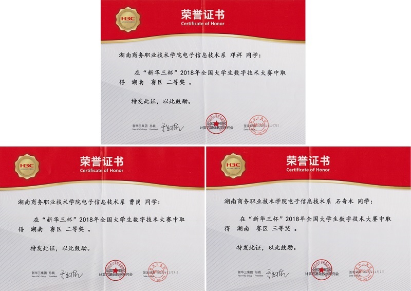 “大赛点燃校园,技术改变人生”。在长沙举办的2018年第八届“新华三杯”全国大学生数字技术大赛中,湖南商务职业技术学院计算机网络技术专业16级学生邓祥等在苏命峰、谢林勇等老师指导下,奋勇拼搏、发挥出色,其中:邓祥、曹岗同学荣获二等奖,石奇术同学荣获三等奖。