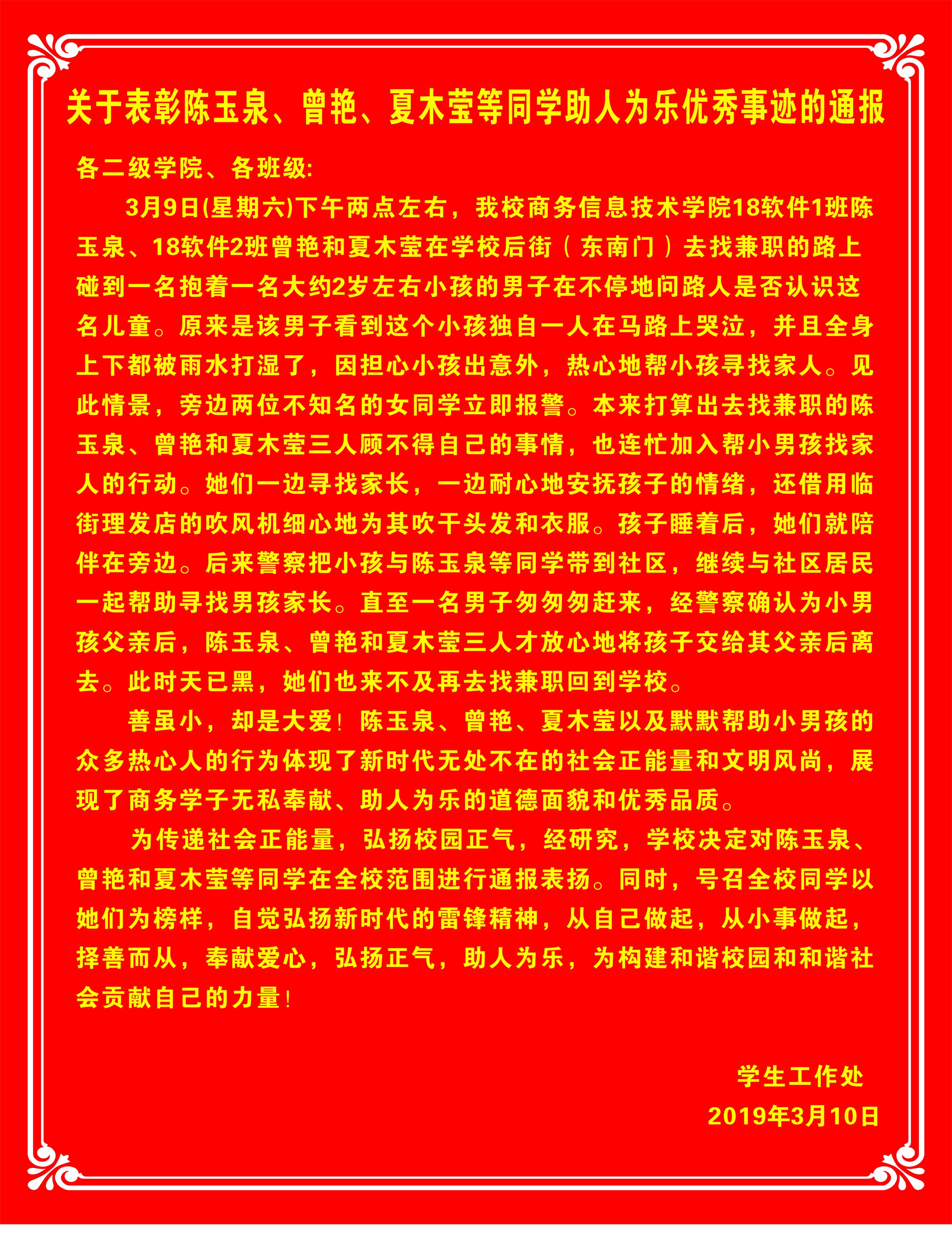 关于表彰陈玉泉、曾艳、夏木莹等同学助人为乐优秀事迹的通报