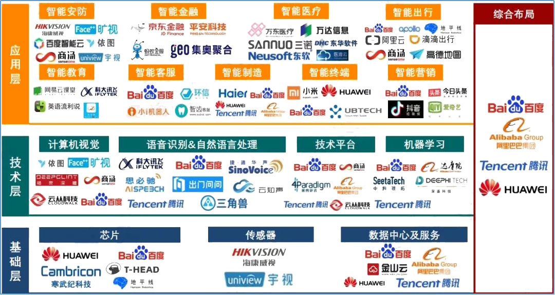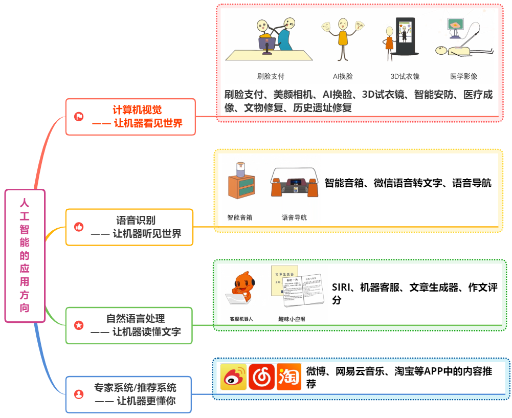 通过专业的学习,学生可以进入以下人工智能技术应用方向的行业中就业和发展,具体应用方向如下图。
