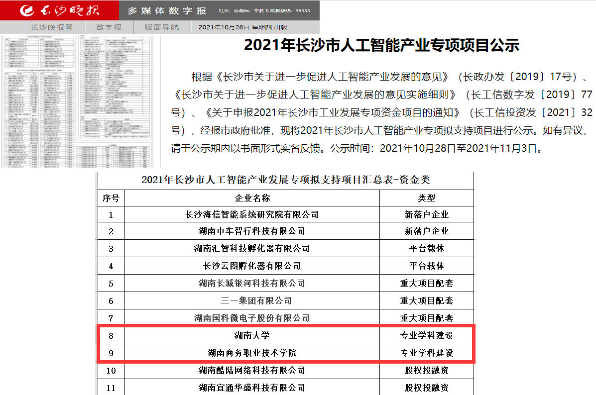 2021年10月,我院人工智能技术应用专业获批长沙市人工智能产业专项项目,在这次产业专项评审中,仅有2所高等院校获批,我校是唯一的高职院校建设单位。