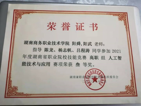 2020年的湖南省职业院校技能大赛“人工智能技术与应用”赛项中,我校选手陈龙、杨志帆、吕程涛同学在阳舜、阳武二位老师的指导下获得三等奖。2021年的“湖南省人工智能训练师”赛项中,我校选手肖佳豪、詹敦厚、李宇明、刘乔同学在许苗华、阳舜二位老师的指导下分获得二、三等奖。
