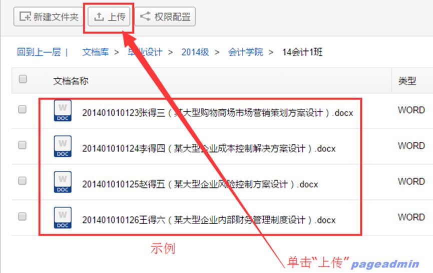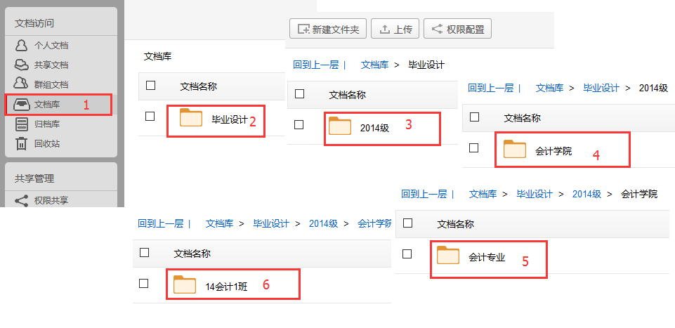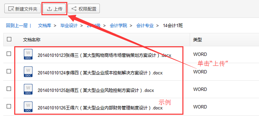 找到自己所在的院->专业->班级,将自己的毕业设计文档上传至自己所在的班级下。