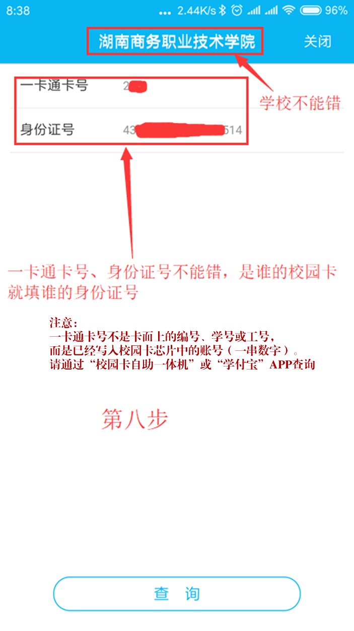 第八步,确认没有选错学校,填入一卡通卡号(卡号不是卡片上的学号或者工号,是已经写入校园卡芯片中的一串数字。可在“校园卡自助一体机”或“学付宝”APP上查询)、身份证号