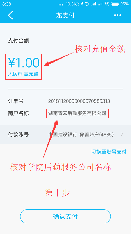 第十步,核对充值金额(建行APP显示为“支付金额”,即充值金额),核对商户名称“湖南青云后勤服务有限公司”(该公司为我院专门用于后勤服务的公司),确认“付款账号”(某些情况下需要你手动输入付款账号),然后点击“确认支付”
