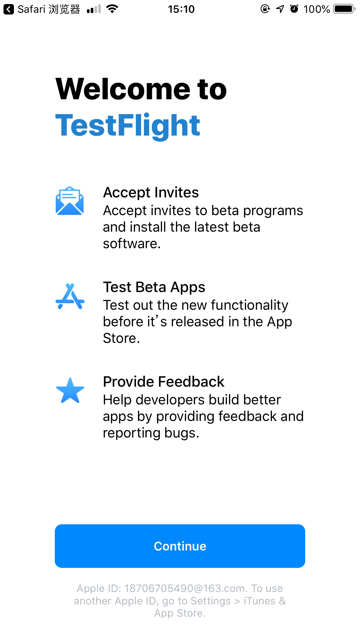 5. 安装testflight完成之后,再回到safari,进行第2步,点击开始测试,会跳到testflight中去: