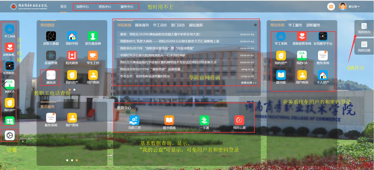 信息门户(PC端)目前集成的业务系统:教务系统、资产系统、OA、在线教学平台(超星)、学工系统、迎新宿舍管理系统、图书馆藏系统、校内云盘(爱数)、一卡通系统、学院官网资讯等10个业务系统,另外还集成了学院通讯录(仅限于教职工查询教职工的电话)。目前,我们可以通过信息门户使用一套用户名和密码登录上述业务系统(学院官网资讯可以直接浏览,无须登录),不再需要单独针对每个业务系统输入用户名和密码。注意:不同类别的用户有不同权限。