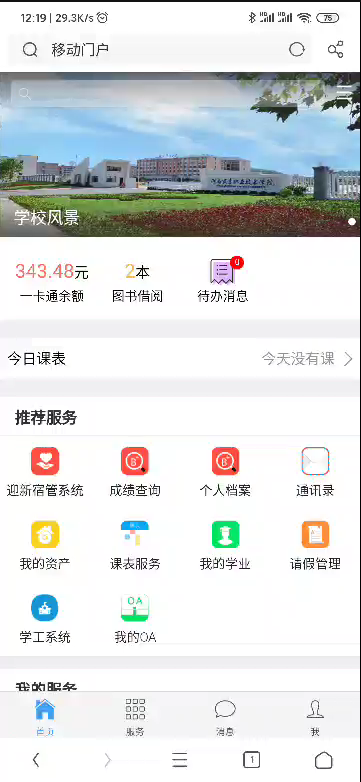 信息门户(移动端)目前集成的业务系统和功能:教务系统中的课表、OA中的待办工作流、一卡通余额和消费记录查询、通讯录查询(仅限于教职工查询教职工的电话,可以直拔)、新迎工作处理、个人名下资产查询、学院官网资讯浏览,以及针对学生的学工服务、课表等。注意:不同类别的用户有不同权限。