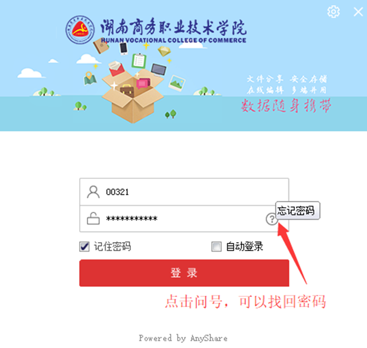 我院校内云盘采用的是来自于上海爱数信息技术股份有限公司的“爱数AnyShare”产品,当前服务器版本号是6.0.13。自当前版本开始,我们采用了客户端定制化技术对校内云盘的WEB端和客户端进行了定制。定制后的客户端软件在登录时不再需要填写服务器地址,界面也做了相应改动(WEB端仍然需要在浏览器输入地址),客户端软件名称变成了“湖南商务云盘”。相关说明如下: