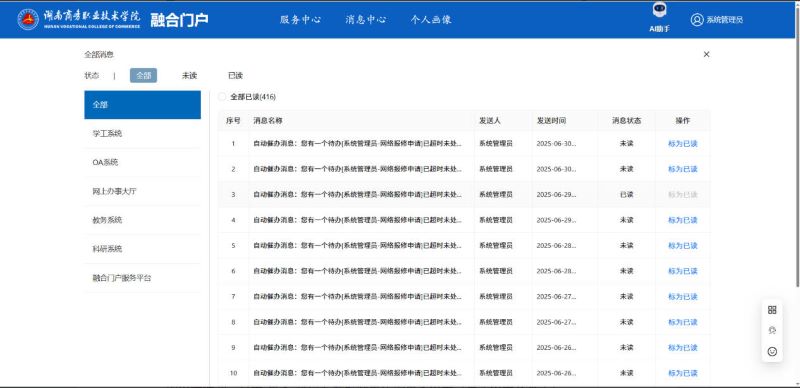 消息中心可以对相关消息进行展示,点击“更多”选项用户可以进入消息中心查看更多消息(可以显示消息的状态,来源等)。