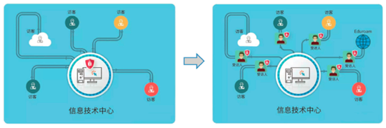 以往的访客身份验证和开户规则,其实是把访客对网络访问的安全责任交给了信息技术中心负责。在访客数量激增后,访客上网的安全审计和溯源难度增加,一旦出现网络安全事件,真正的责任人追溯比较困难,加大了信息技术中心的安全责任。