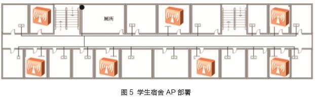 学生使用的多为笔记本电脑、PAD、手机等上网设备,WiFi模式主要是11n模式,少量11ac模式。在该场景下选用面板型、11ac设备。如图5所示,每个AP负责所在宿舍、左右两间宿舍及过道内的无线信号覆盖。