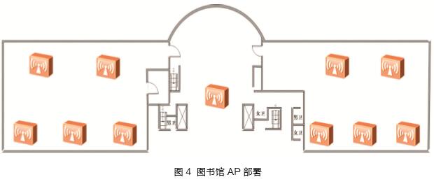 图书馆终端主要为笔记本、PAD,WiFi网卡模式主要为11g/n/ac。在该高密度场景下选用放装型、11ac设备。如图4所示,在每间阅览室天花板上均匀安装5个AP,阅览室之间的大厅天花板安装1个AP。