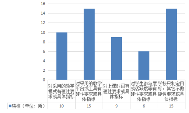 各高校对在线教学开展有无硬性要求或具体指标方面,各校的情况差异明显,如图5所示。50%的高校对采用的教学平台或工具有硬性要求或具体指标;50%的学校只制定目标,其他不做硬性要求或具体指标%;33%的高校对采用的教学模式有硬性要求或具体指标,同时30%的高校对上课时间也有硬性要求或具体指标;还有20%的高校对学生参与度或活跃度等有硬性要求或具体指标。