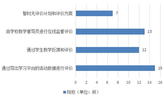 对于疫情期间学校开展的在线教学质量的评价标准,详情如图12所示。50%的高校都选择通过导出学习平台的活动数据进行评价;43%的高校也将采用由学校教学督导员进行在线监督评价;还有40%的高校将通过学生的教学反馈进行评价;另有23%的高校目前还暂无任何评价计划和方案。