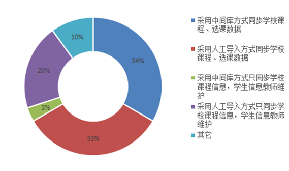 学校在使用云端应用时是否同步学校课程、选课数据的情况也各有不同,详情如图15所示。34%的高校选择采用中间库方式同步学校课程、选课数据;33%的高校采用人工导入方式同步学校课程、选课数据;20%的高校采用人工导入方式只同步学校课程信息,学生信息由教师维护;只有3%的高校采用中间库方式只同步学校课程信息,学生信息教师维护。