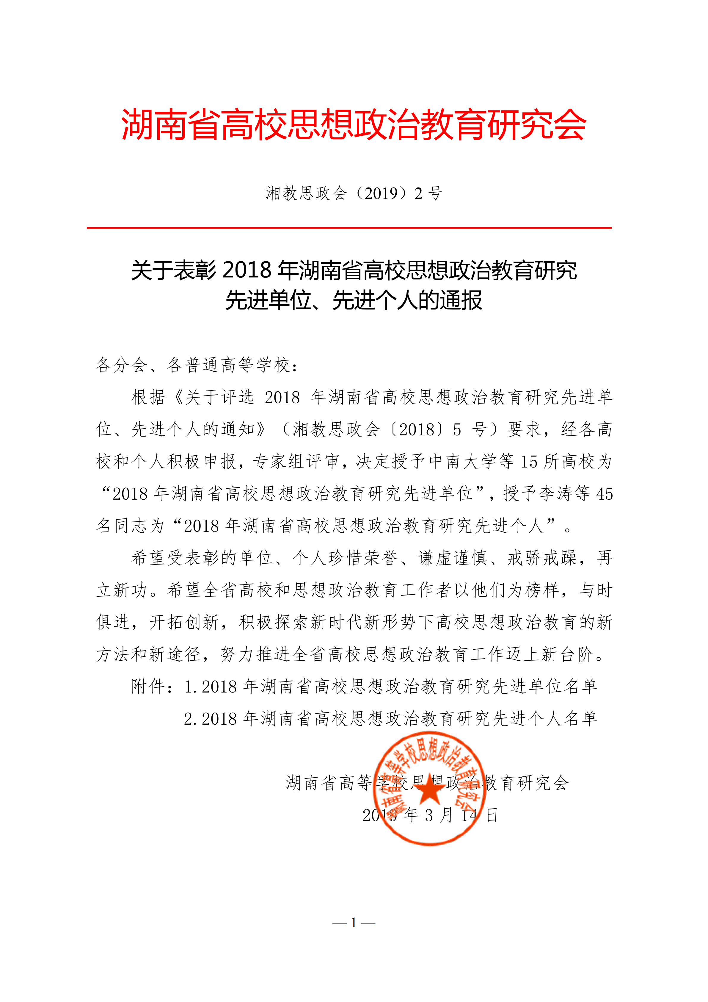 日前,从湖南省高校思想政治教育研究会获悉,在“2018年湖南省高校思想政治教育硏究先进单位、先进个人”评选中,我校被评为“2018年湖南省高校思想政治教育研究先进单位”,我部邓艳君同志被评为“2018年湖南省高校思想政治教育研究先进个人”。