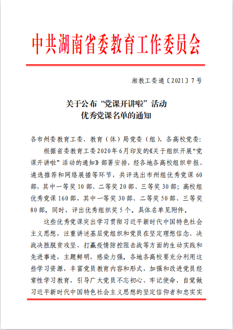 为深入学习贯彻习近平新时代中国特色社会主义思想,进一步巩固拓展 “不忘初心、牢记使命”主题教育成果,湖南省教育工委在全省开展了“党课开讲啦”优秀党课展示竞赛活动。马克思主义学院肖彬老师的党课《改革开放是决定当代中国命运的关键一招》获得全省一等奖。