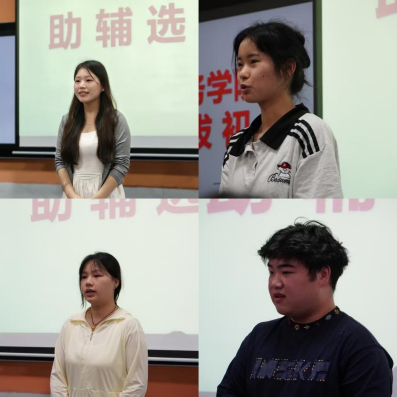 选拔现场气氛紧张而热烈,候选人依次登台,从容分享在班级或团学分会的工作经验,展示个人优势。面对即兴问答环节,选手们沉着应答,用清晰的思路与真诚的表达,展现对助理辅导员岗位的深刻理解与履职决心。