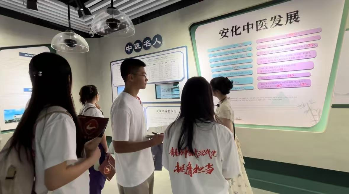 (通讯员戴娟、郑婷)7月8日晨光初露时,湖南商务职业技术学院“爱向远山行”安化分队的8名师生已集合完毕。在共青团安化县委副书记车德衢的陪同下,团队前往城南黄沙坪社区青年创业基地,开启了充实的实践之旅。首站抵达安化中医药文化馆,墙上17位名中医的名字从国家级到县级依次排列,每一个名字都承载着医者仁心。“这位88岁的刘祖贻先生,是湖南省首位国医大师,至今仍在长沙坐诊。”讲解员谌嘉瑞介绍道,共青团安化县委副书记车德衢及团队成员在参观中不时交流,让大家对当地中医药传承有了更深认识。