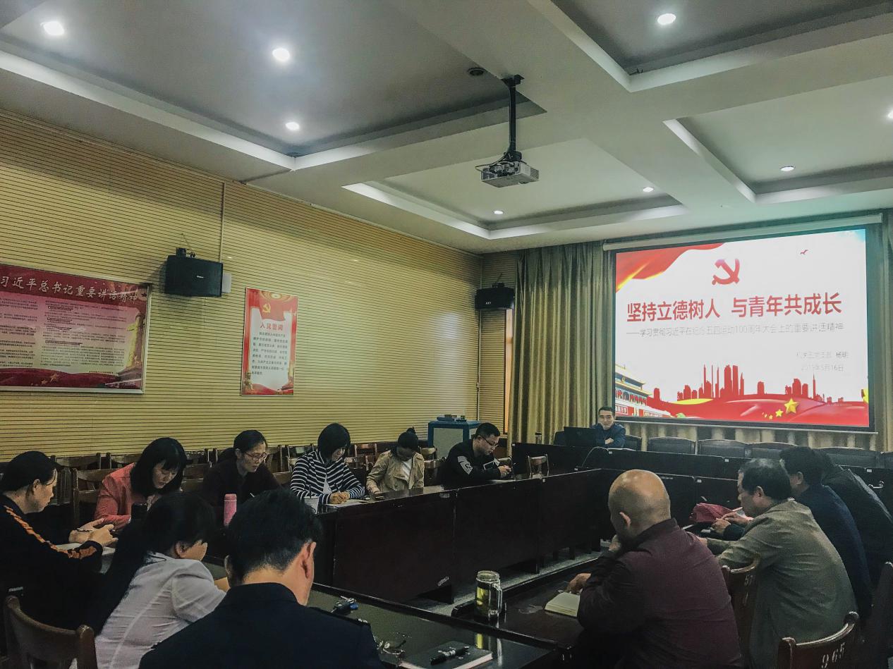 纪念五四运动100周年大会4月30日上午10时30分在人民大会堂举行。中共中央总书记、国家主席、中央军委主席习近平总书记出席大会并发表重要讲话。讲话思想深刻、内涵丰富、意义重大、影响深远,具有很强的思想性、指导性和针对性,为教育事业改革发展进一步指明了前进方向,提供了根本遵循。为深入学习贯彻习近平总书记的重要讲话精神,5月16日下午14:30,五党支部在第五会议室组织召开了“坚持立德树人 与青年共成长”主题党日活动,支部书记杨明同志讲授专题党课,罗佳玲、黄郁娇同志作学习分享。