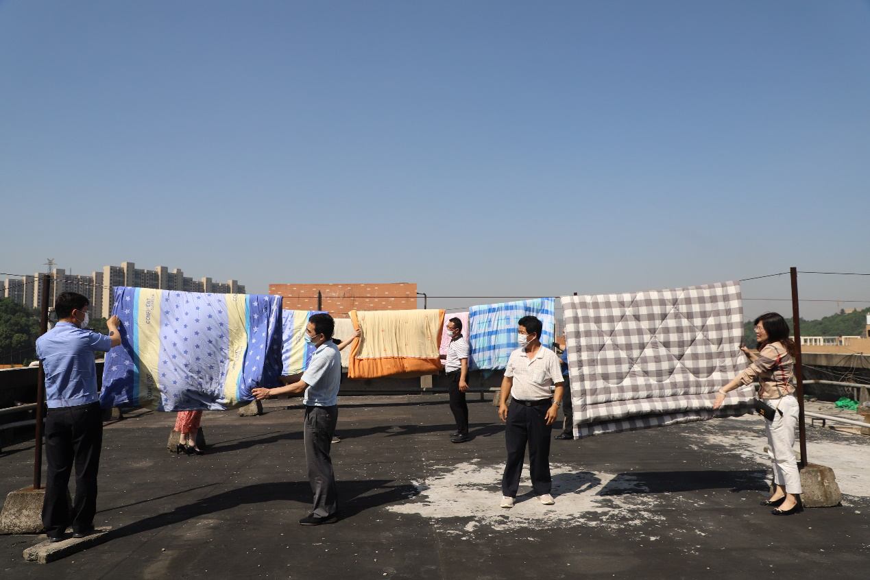 会上主要安排了5月12日为学生晾晒被褥的志愿服务活动。12日上午,五党支部主要整理、晾晒了学生4栋宿舍被褥,收拾了宿舍腐烂食物。为防止被子错拿,所有参与晒被子工作的党员,提前按照寝室门牌号和床铺位置给被子等床上用品贴上标签,再拿到阳台、宿舍顶楼等地方晾晒,并翻动、拍打被子上的灰尘。下午被子收回后,折叠好再送回原寝室的相应床位。