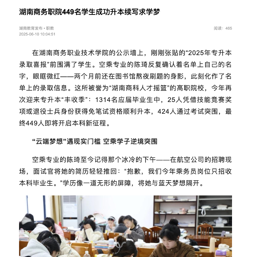 湖南教育发布报道——湖南商务职院449名学生成功升本续写求学梦