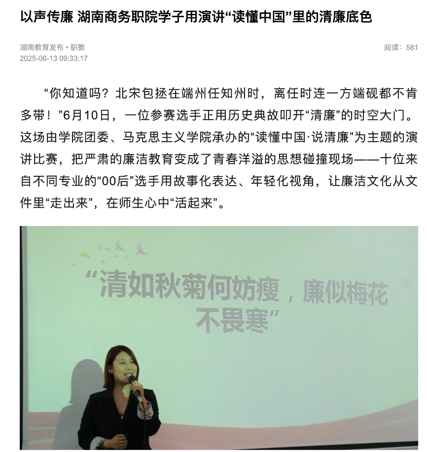 湖南教育发布报道——以声传廉 湖南商务职院学子用演讲“读懂中国”里的清廉底色